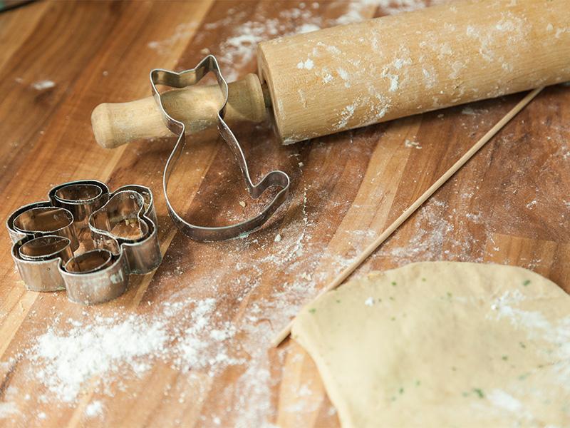 5. Den Teig auf einer gut bemehlten Arbeitsfläche ca. 1 cm dick ausrollen und die gewünschten Motive ausstechen.