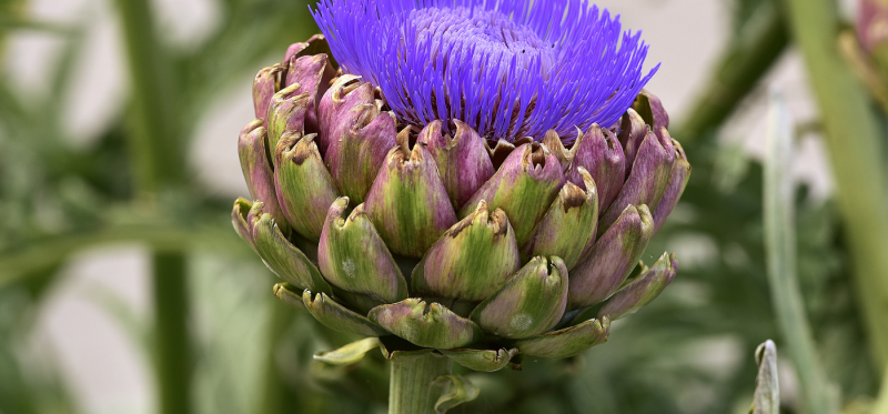 Les fleurs sont de couleur bleu-violet. Ils peuvent être récoltés et préparés comme légumes avant la floraison et sont également très populaires comme décoration. L'artichaut provient de la région méditerranéenne.