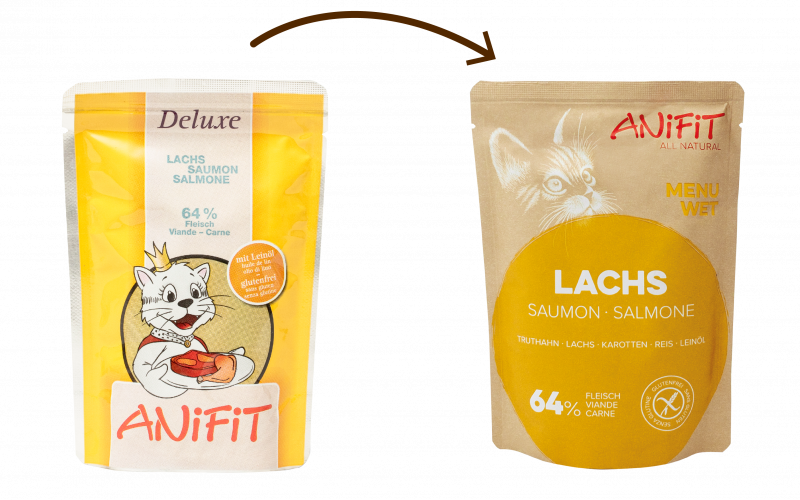 ANiFiT è sinonimo di alimenti naturali per animali domestici di alta qualità, e questo si riflette anche a livello visivo. Le ricette e quindi il contenuto dei nostri prodotti di alta qualità rimangono invariati. La dichiarazione aperta e onesta al 100% di tutti gli ingredienti si trova, come sempre, sul retro del prodotto e sulla pagina del prodotto nello Shop online. Il nuovo design della confezione è semplificato e più strutturato, per aiutare a cogliere rapidamente tutte le informazioni. Al centro si trovano i colori verde e giallo, che rappresentano i rispettivi assortimenti peri cani o gatti. I prodotti adatti a cani e gatti appaiono ora in marrone, in modo che sia chiaramente facile vedere per quale tipo di animale è adatto il cibo.